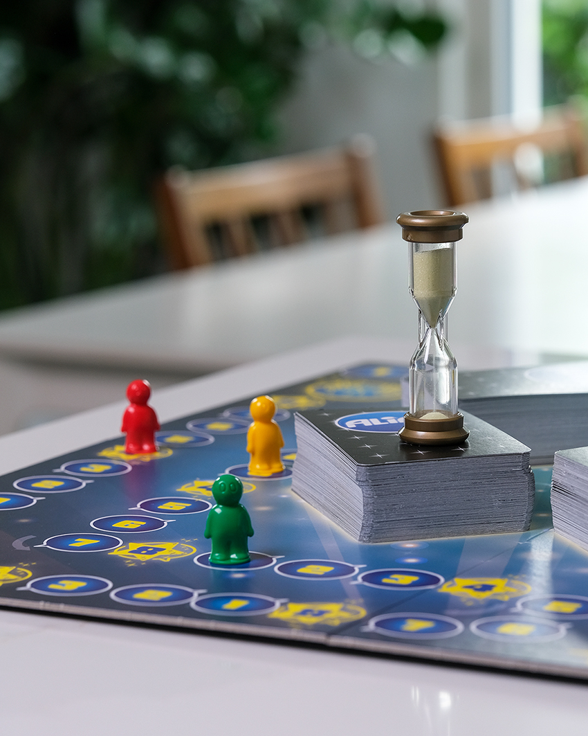 Content: Game Board with a Built-in Spinner, 6 Game Pieces, 400 Cards, Sand Timer and Rules.